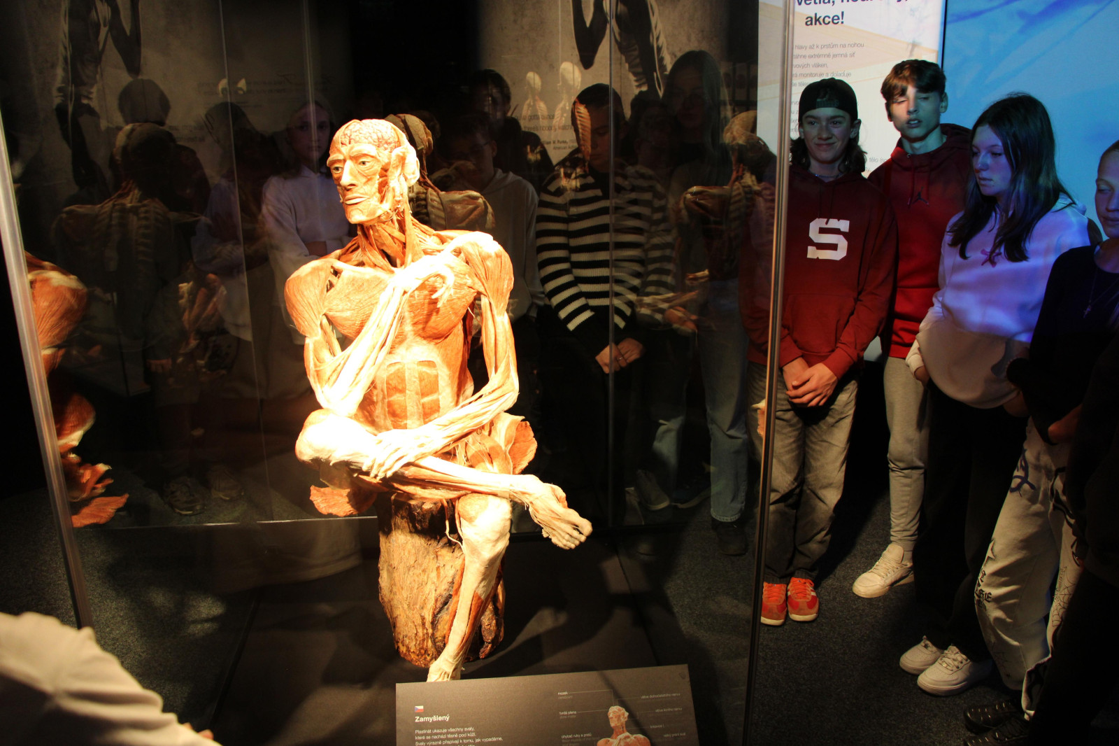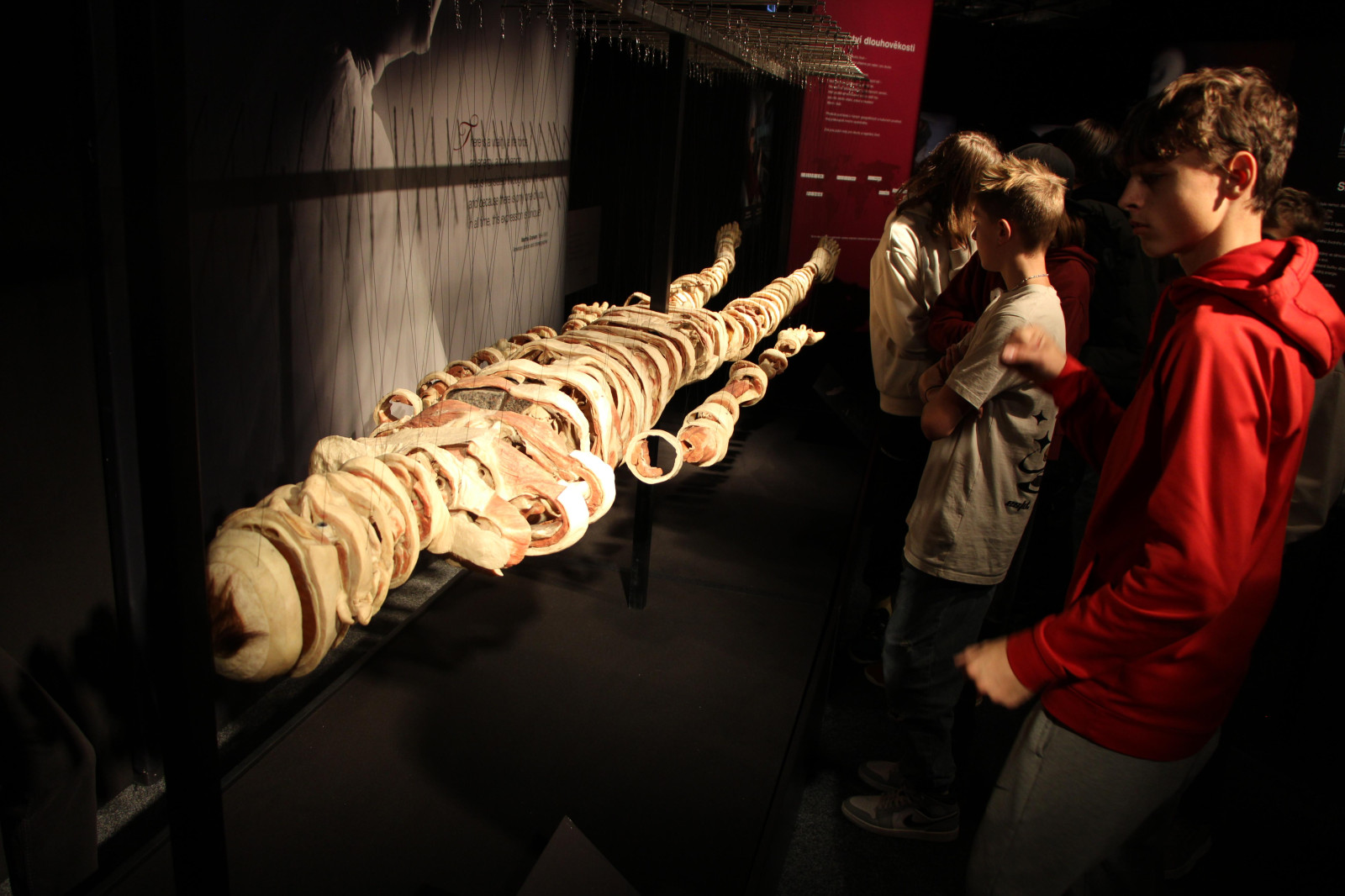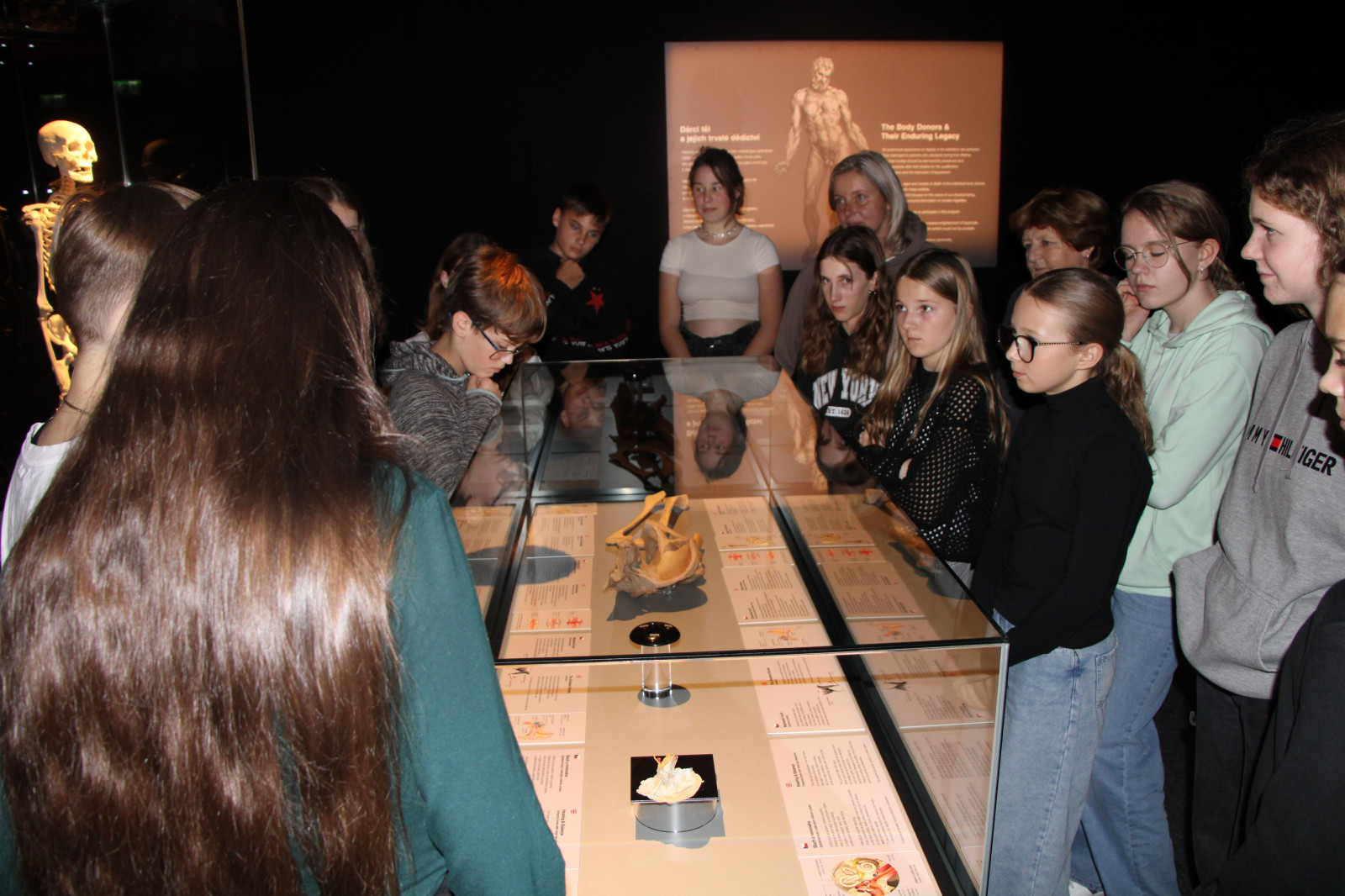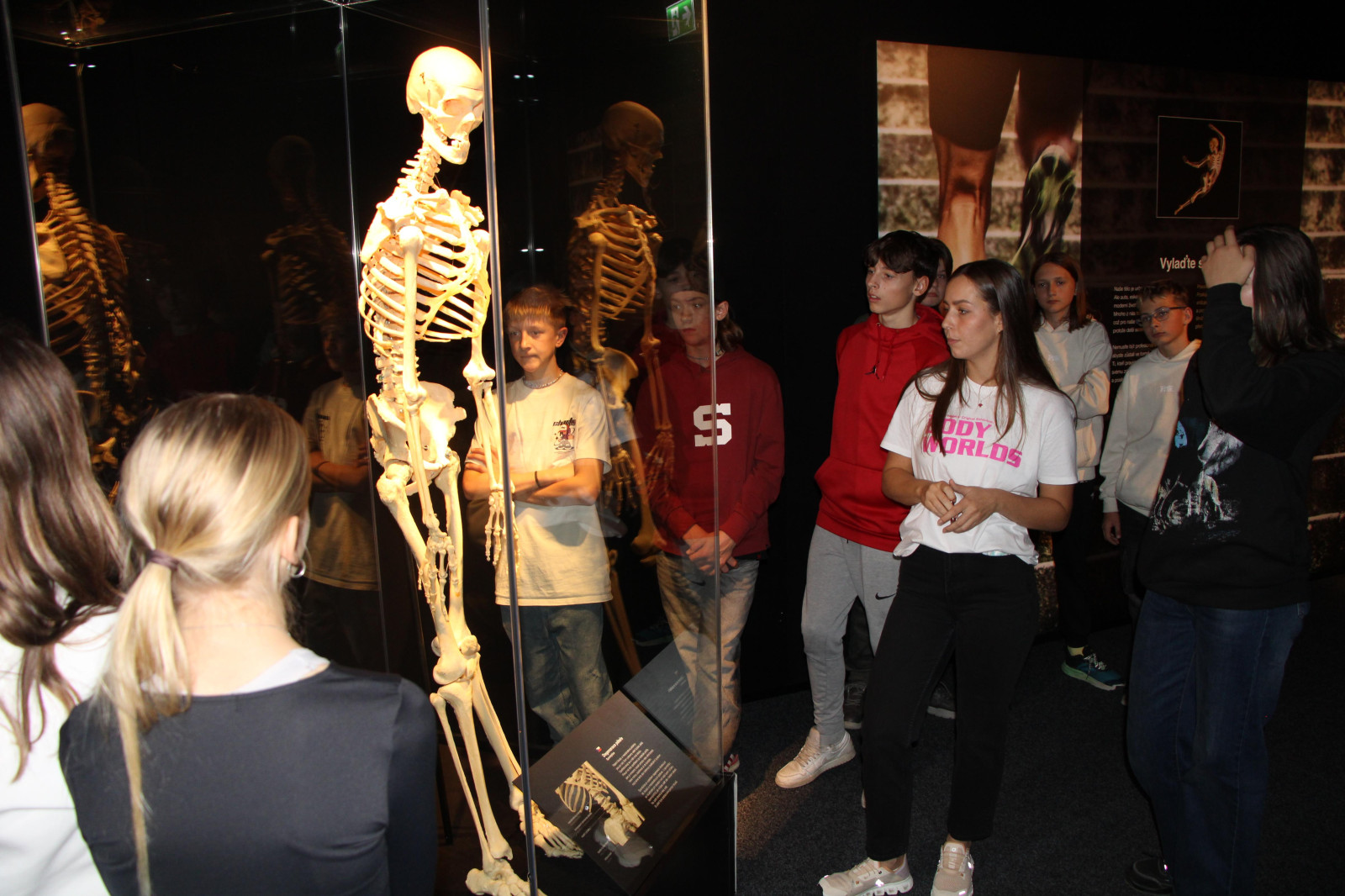 V úterý 21. října proto brzy ráno vyrazili žáci přírodovědných praktik i osmé třídy do Národního muzea. Ačkoli byla komentovaná prohlídka beznadějně vyprodaná, podařilo se nám domluvit termín ještě před otevírací dobou. Vyhnuli jsme se tak dlouhým frontám a mohli si v klidu vychutnat výklad k originálním fosiliím jen pro sebe. Po prohlídce našich dávných předků jsme navštívili i další expozice – Lidé a jejich předci, Zázraky evoluce či Okno do pravěku. Následoval přesun metrem na Chodov, kde si žáci užili rozchod – někteří si dali oběd, jiní využili čas k nakupování. Po pauze nás čekala druhá část exkurze – výstava Body Worlds: Tělo v pohybu. Rozdělili jsme se na dvě skupiny, o které se postarali studenti medicíny. Ti nám poskytli poutavý výklad k jedinečnému pohledu do nitra skutečného lidského těla. Žáci se tak seznámili s fungováním všech hlavních orgánových soustav.