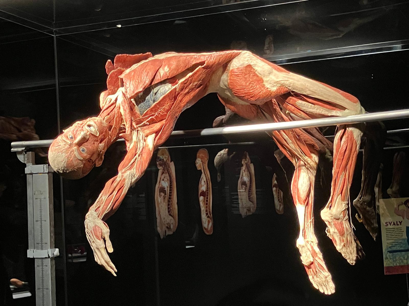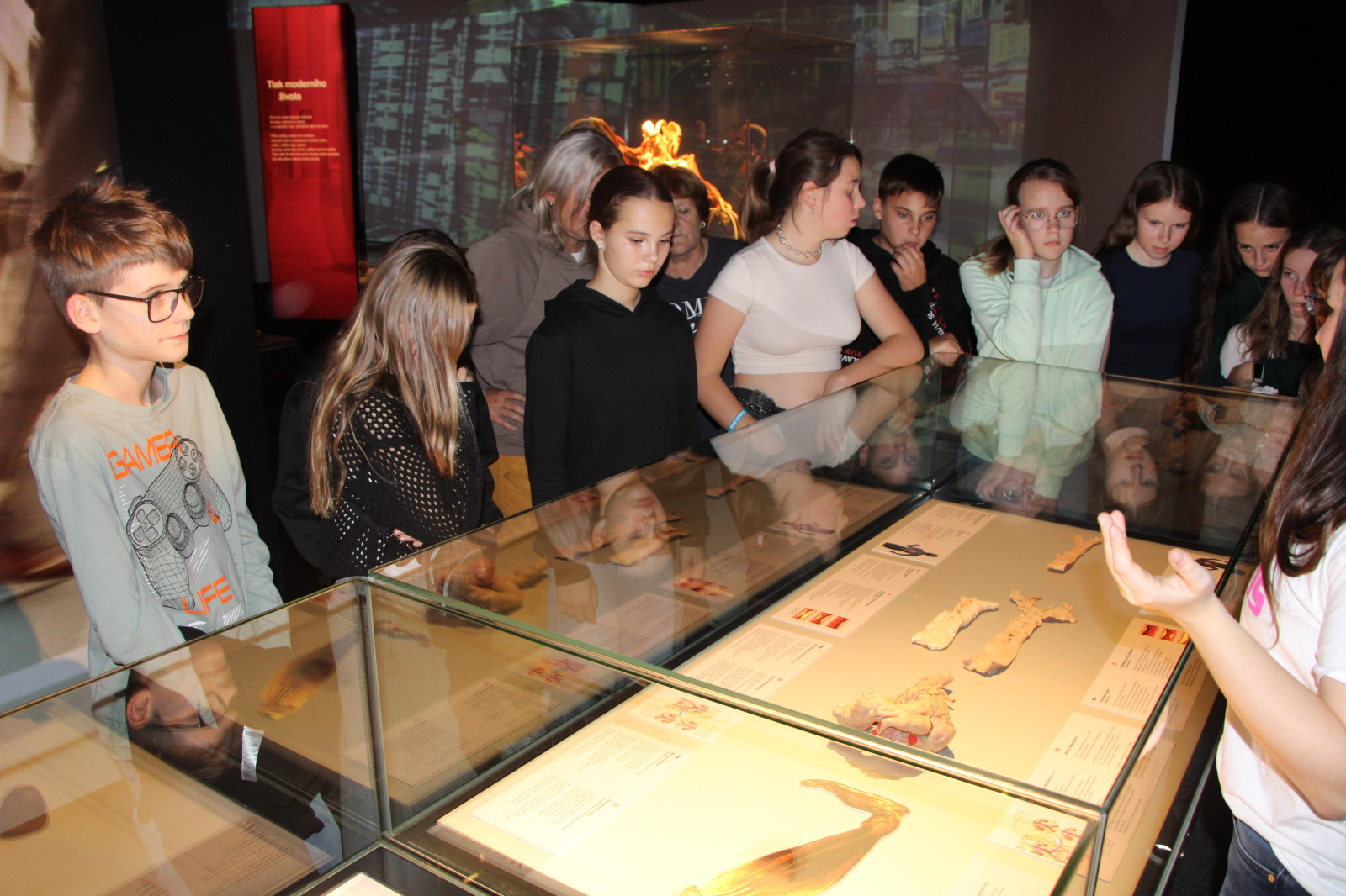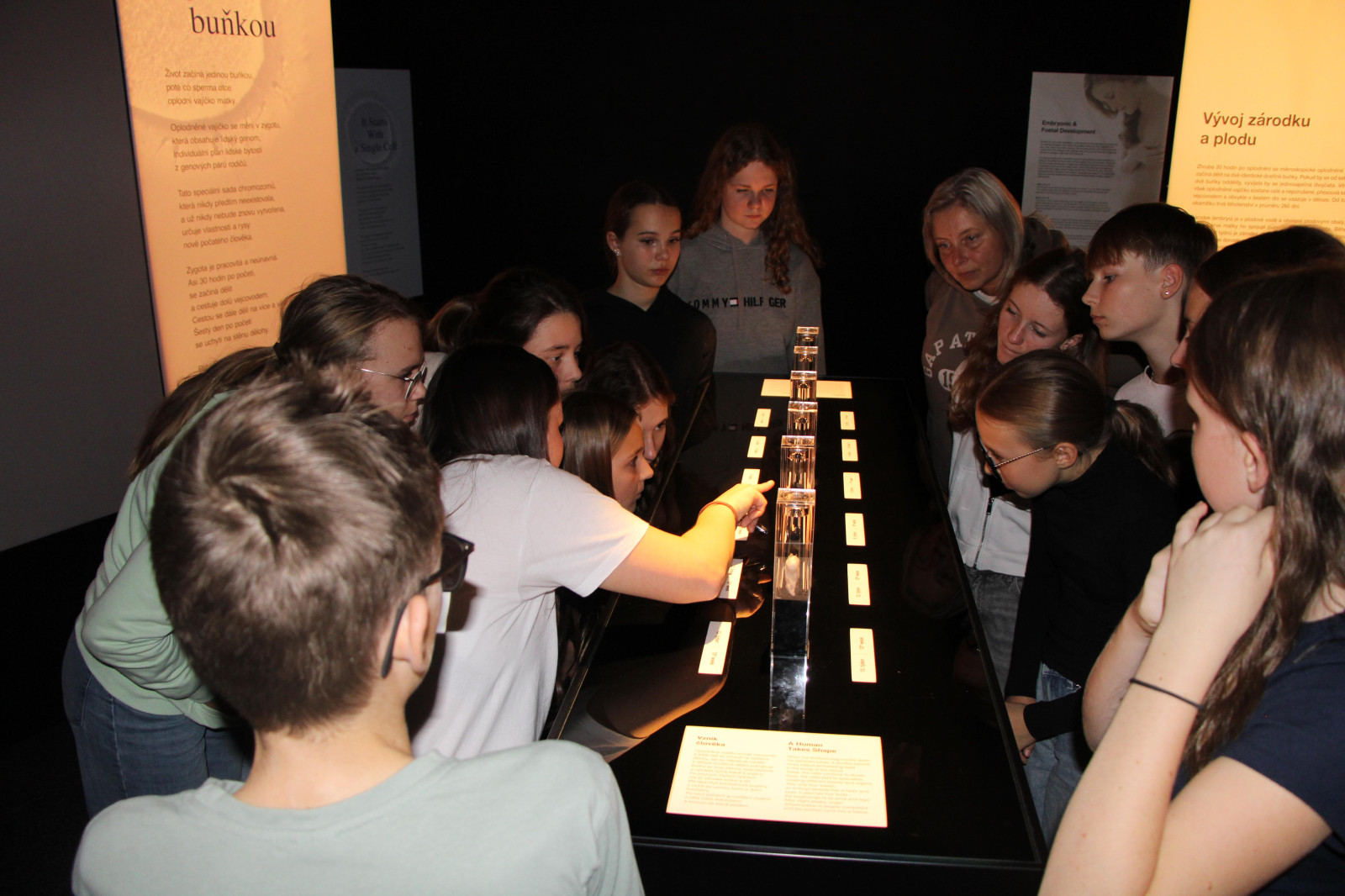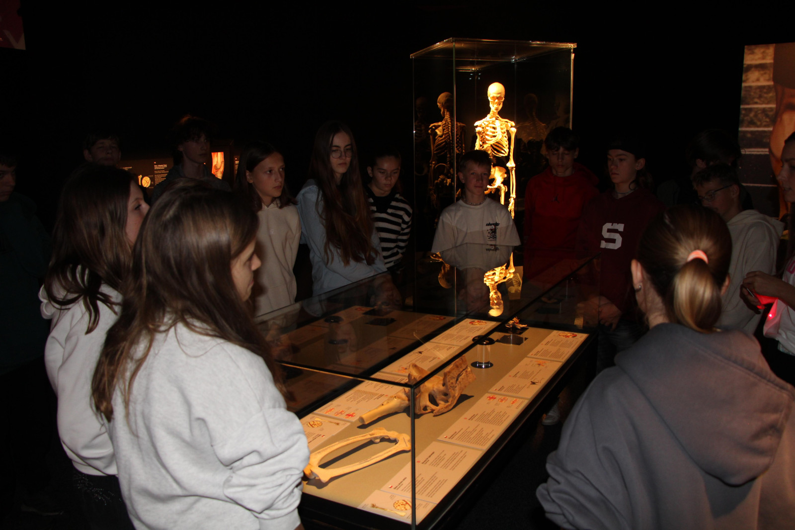 V úterý 21. října proto brzy ráno vyrazili žáci přírodovědných praktik i osmé třídy do Národního muzea. Ačkoli byla komentovaná prohlídka beznadějně vyprodaná, podařilo se nám domluvit termín ještě před otevírací dobou. Vyhnuli jsme se tak dlouhým frontám a mohli si v klidu vychutnat výklad k originálním fosiliím jen pro sebe. Po prohlídce našich dávných předků jsme navštívili i další expozice – Lidé a jejich předci, Zázraky evoluce či Okno do pravěku. Následoval přesun metrem na Chodov, kde si žáci užili rozchod – někteří si dali oběd, jiní využili čas k nakupování. Po pauze nás čekala druhá část exkurze – výstava Body Worlds: Tělo v pohybu. Rozdělili jsme se na dvě skupiny, o které se postarali studenti medicíny. Ti nám poskytli poutavý výklad k jedinečnému pohledu do nitra skutečného lidského těla. Žáci se tak seznámili s fungováním všech hlavních orgánových soustav.