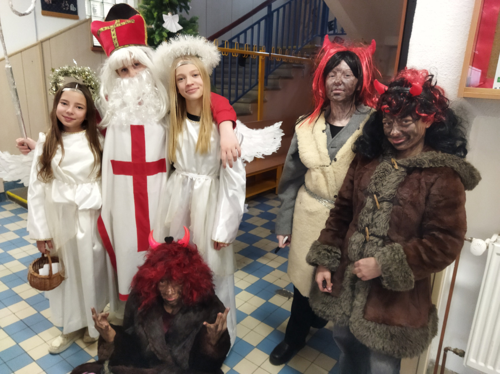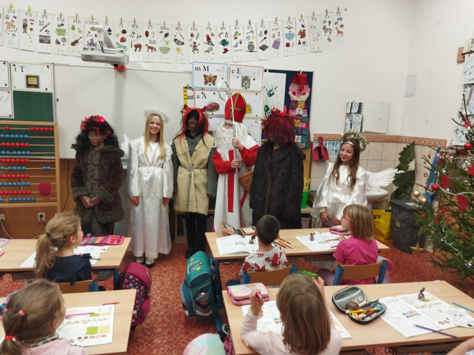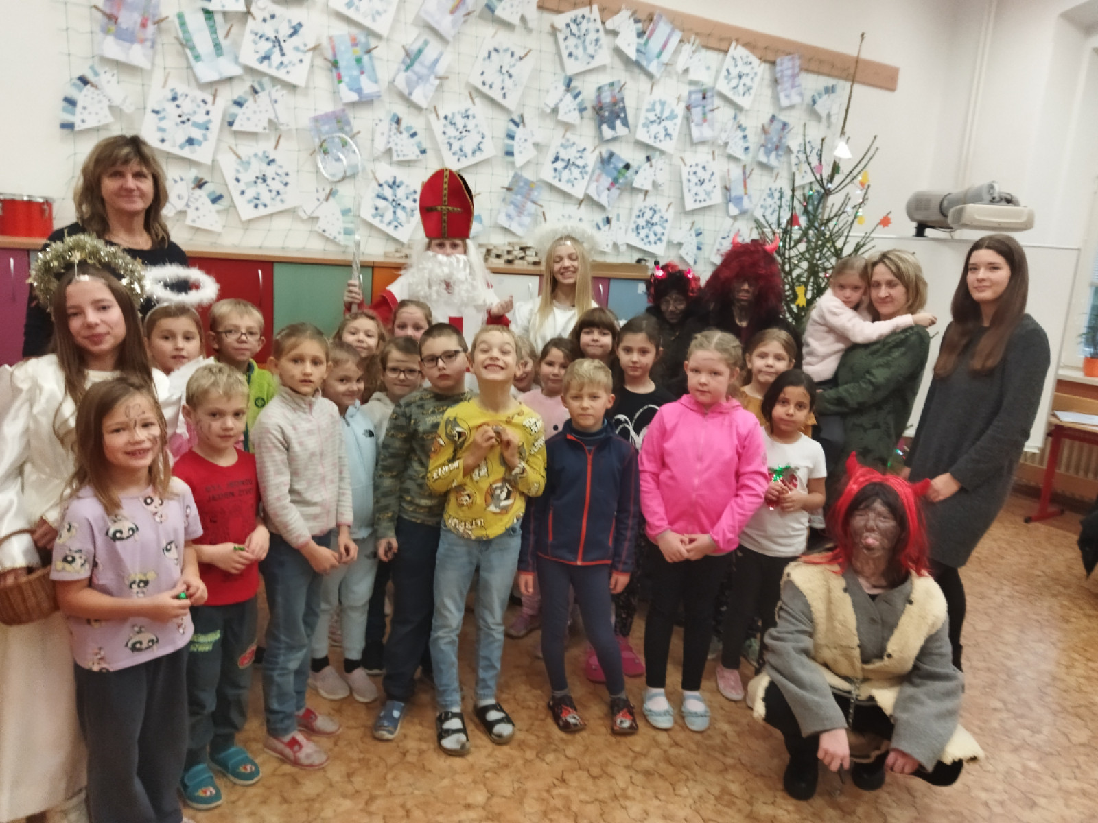Pátého prosince jste i v naší škole mohli potkat Mikuláše s anděly a čerty. Pro své mladší spolužáky si letos nadílku připravily děti, které navštěvují nepovinný předmět jevištní průprava. Jejich záměrem nebylo strašit, ale zaměřily se spíše na povzbuzení a pochvaly. Za písničku, splnění drobných čertovských úkolů a zodpovězení andělských otázek dostali všichni malou sladkou odměnu.
