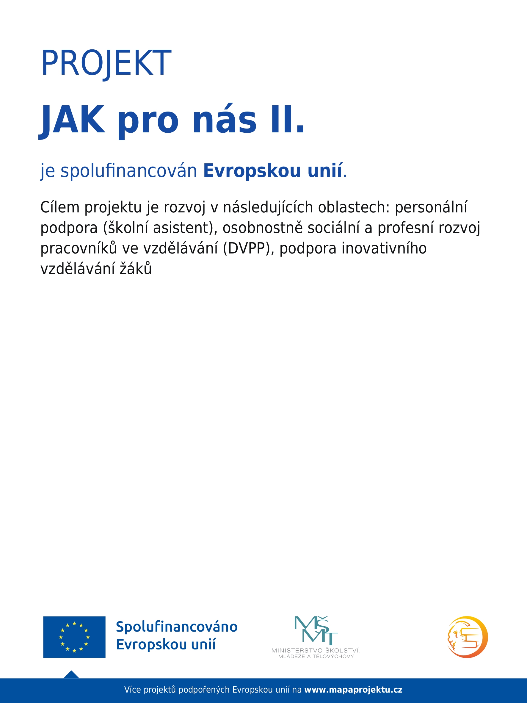 Cílem projektu je rozvoj v následujících oblastech: personální podpora (školní asistent), osobnostně sociální a profesní rozvoj pracovníků ve vzdělávání (DVPP), podpora inovativního vzdělávání žáků.